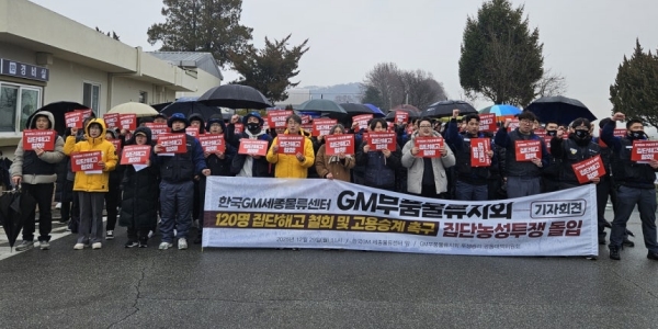 ▲ 한국GM 세종물류센터 하청 노동자들이 점거 농성을 벌이면서 전국에서 한국GM 차량 수리에 차질이 이어지고 있다. 사진은 한국GM 세종물류센터 하청 노동자들이 2025년 12월29일 세종물류센터 앞에서 기자회견을 열고 있는 모습. <전국금속노동조합 대전충북지부>
