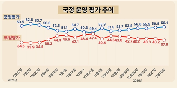 직전 조사(1월28일 발표)와 비교해 긍정평가는 1.2%포인트 올랐고, 부정평가는 2.3%포인트 하락했다. 긍정평가와 부정평가 격차는 20.2%포인트였다.