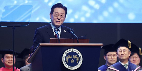 이재명 대통령이 20일 대전 한국과학기술원(KAIST)에서 열린 학위수여식에서 축사를 하고 있다. <연합뉴스>