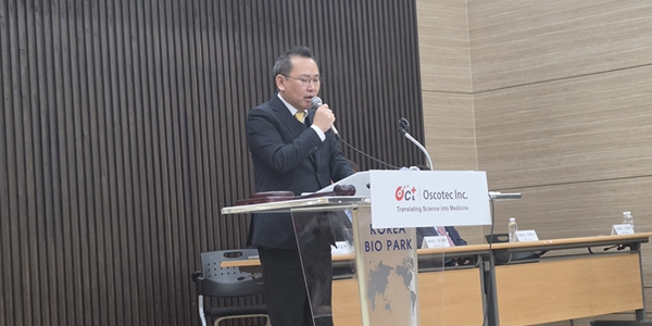 ▲ 이상현 오스코텍 대표이사(사진)가 경기도 성남시 분당 코리아바이오파크에서 열린 오스코텍 주주총회에서 의장으로 인사말을 하고 있다. <비즈니스포스트>