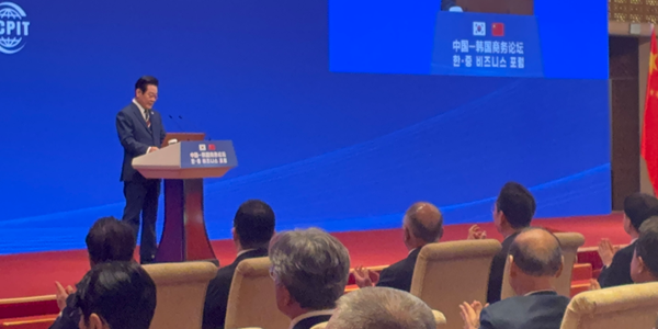 ▲ 5일 이재명 대통령의 방중 기간 열린 한·중 비즈니스 포럼에서 이재명 대통령이 발언하는 가운데 최병오 패션그룹형지 회장(무대 두 번째 줄에서 오른쪽으로부터 두 번째)이 박수를 치며 호응하는 모습. <패션그룹형지>