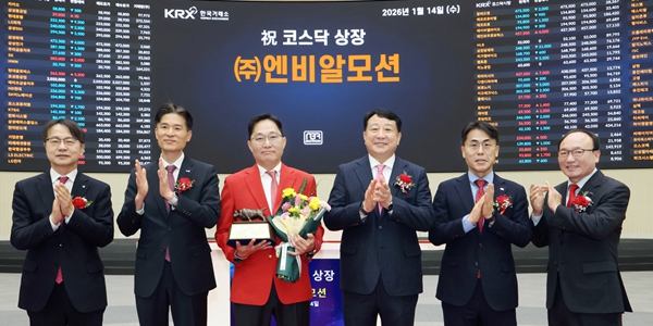 ▲ 14일 서울 여의도 한국거래소에서 열린 엔비알모션 코스닥시장 상장기념식에서 관계자들이 기념 촬영하고 있다. <한국거래소>
