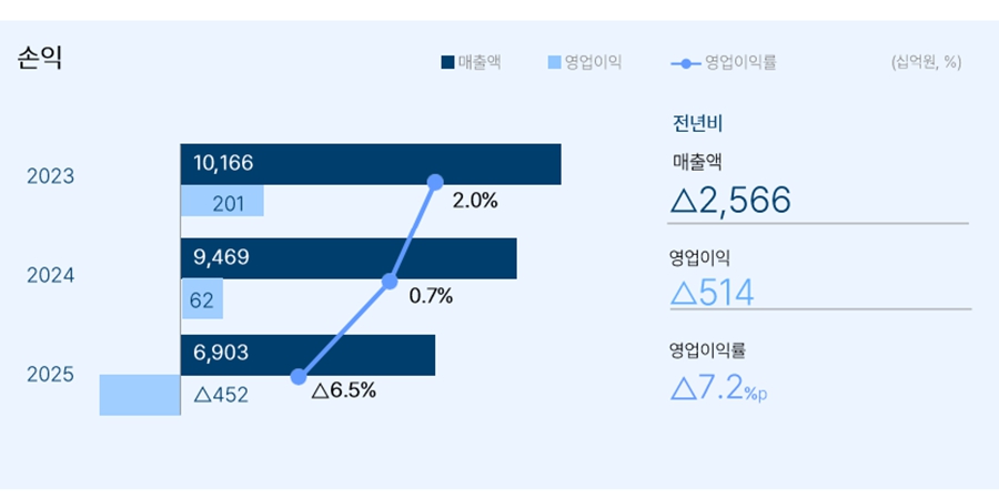 29일 포스코홀딩스에 따르면 포스코이앤씨는 지난해 매출 6조9030억 원, 영업손실 4520억 원을 냈다. 2024년과 비교해 매출은 27% 줄어든 것이며 영업손실을 내며 적자로 전환했다.