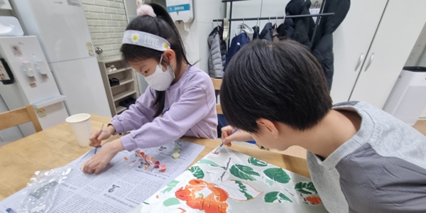 ▲ 연장돌봄 서비스를 제공하고 있는 마을돌봄시설에서 아이들이 미술 활동을 하고 있는 모습. < KB금융 >