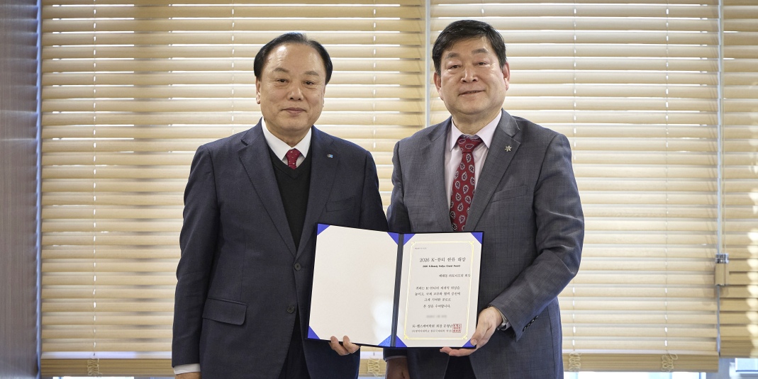 ▲ '2026 K-뷰티 한류 대상'을 수상한 배해동 토니모리 회장(왼쪽)과 문형남 K헬스케어학회 회장(오른쪽)