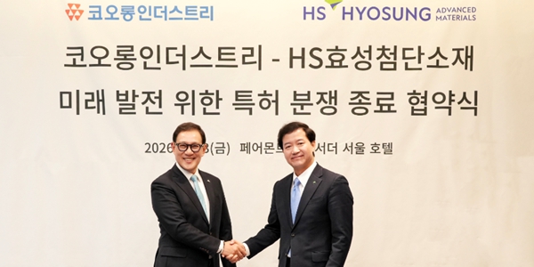 코오롱인더스트리, HS효성첨단소재는 13일 서울 영등포구 여의도에 위치한 '페어몬트 앰배서더 서울'호텔에서 '코오롱인더스트리-HS효성첨단소재 미래 발전 위한 특허 분쟁 종료 협약'을 체결했다고 밝혔다.