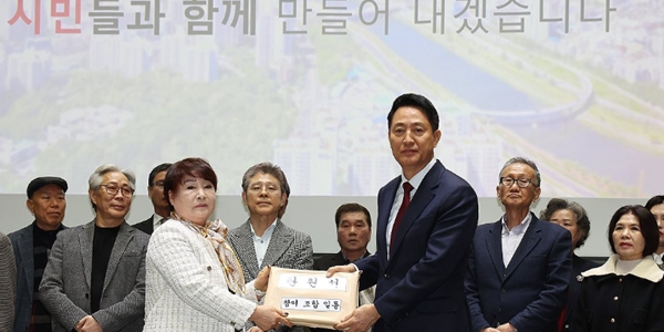 ▲ 오세훈 서울시장이 26일 시청에서 열린 발표회에서 조합장들로부터 탄원서를 전달받고 있다. <연합뉴스>