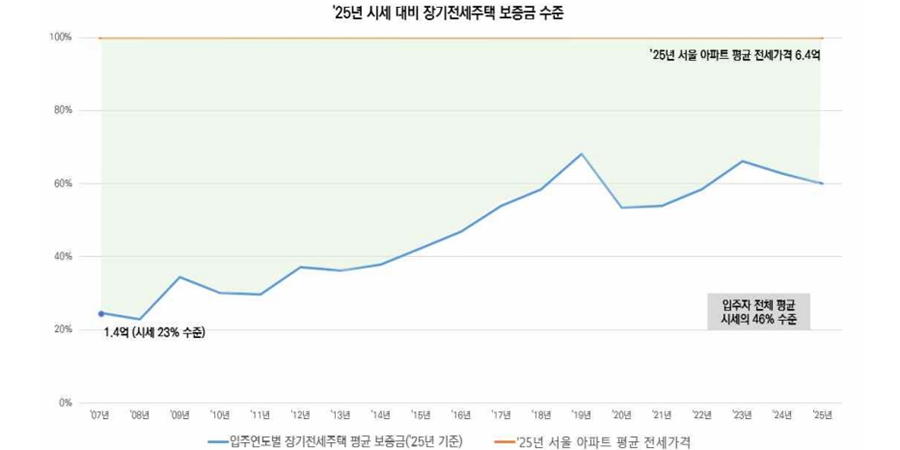 이 가운데서도 장기전세주택이 도입된 2007년 입주자들은 현재 시세 대비 23% 수준의 보증금으로 거주하고 있는 것으로 파악됐다.
