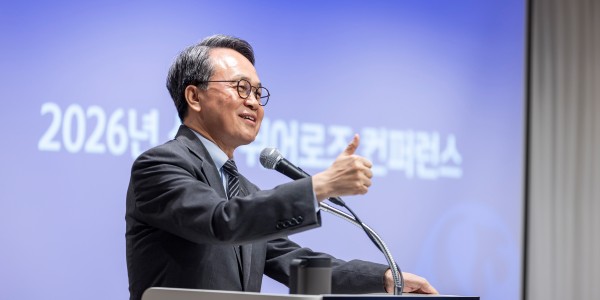 ▲ 진옥동 신한금융지주 대표이사 회장이 6일 서울시 중구 로얄호텔에서 열린 ‘2026 신한 쉬어로즈(SHeroes) 콘퍼런스’에 참여해 축사를 하고 있다. <신한금융그룹>