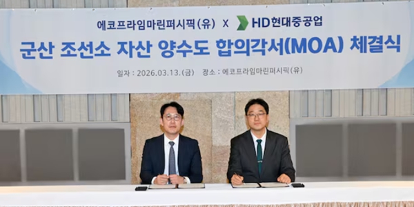 [비즈니스포스트] HD현대중공업은 13일 에코프라임마린퍼시픽 유한회사와 전북 군산시에 위치한 회사의 조선소 자산 양수도를 위한 합의각서(MOA)를 체결했다고 13일 공시했다.