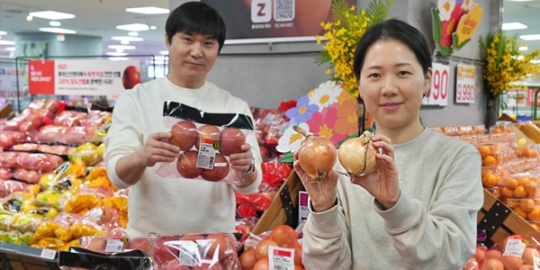 ▲ 채희철 롯데마트·슈퍼 과일MD(왼쪽)와 권희란 롯데마트·슈퍼 채소MD가 18일 서울시 송파구에 위치한 롯데마트 제타플렉스 잠실점에서 각각 '기체제어' 저장 사과와 양파를 홍보하고 있다. <롯데마트·슈퍼>