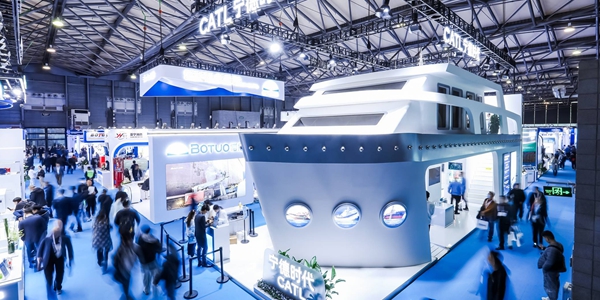▲ 중국 CATL이 2025년 12월2일 상하이 국제박람회장(SNIEC)에서 열린 마리텍차이나 행사장에 선박 모형을 본딴 전시 부스를 세운 모습. < CATL >