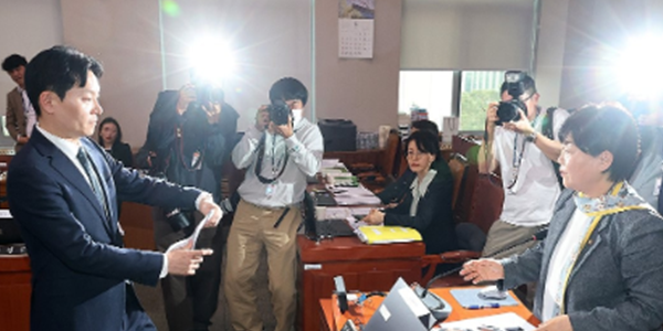 ▲  '쌍방울 대북 송금' 사건을 수사했던 박상용 인천지방검찰청 부부장검사가 3일 국회에서 열린 '윤석열정권 정치검찰조작기소 의혹사건 진상규명' 국정조사특별위원회 전체회의에서 서영교 위원장에게 증인선서 거부 소명서를 제출하고 있다. <연합뉴스>