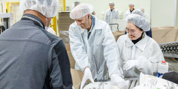 ▲ 해롤드 로저스 쿠팡 임시대표(왼쪽)가 8일 청주의 한 곡류 가공업체에서 전병순 광복영농조합 대표(오른쪽)와 함께 상품 공정을 둘러보고 있다. <쿠팡>