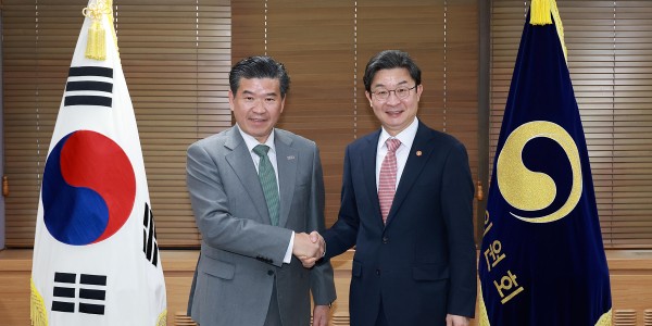 ▲ 이억원 금융위원장(오른쪽)이 10일 서울 종로구 정부서울청사에서 제임스 김 주한미국상공회의소 회장 겸 대표이사와 만나 기념사진을 찍고 있다. <금융위원회>