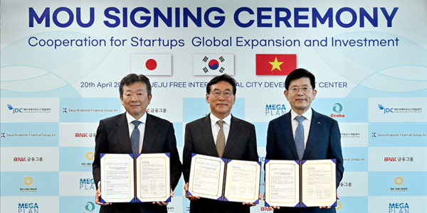 BNK금융그룹은 20일 제주도에서 제주국제자유도시개발센터와 일본 도쿄키라보시금융그룹, 베트남 탄롱그룹과 ‘스타트업 해외 사업 진출 지원을 위한 업무협약’을 맺었다고 21일 밝혔다.
