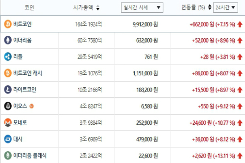 이 밖에 라이트코인(8.97%)과 이오스(9.12%), 모네로(10.77%) 등의 시세도 상승세를 보였다.