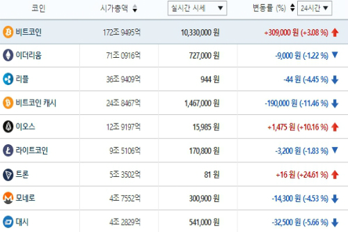 25일 가상화폐 거래소 빗썸에서 비트코인은 오후 3시30분 기준 1BTC(비트코인 단위)당 1033만 원에 거래됐다. 24시간 전에 비해 3.08% 올랐다.