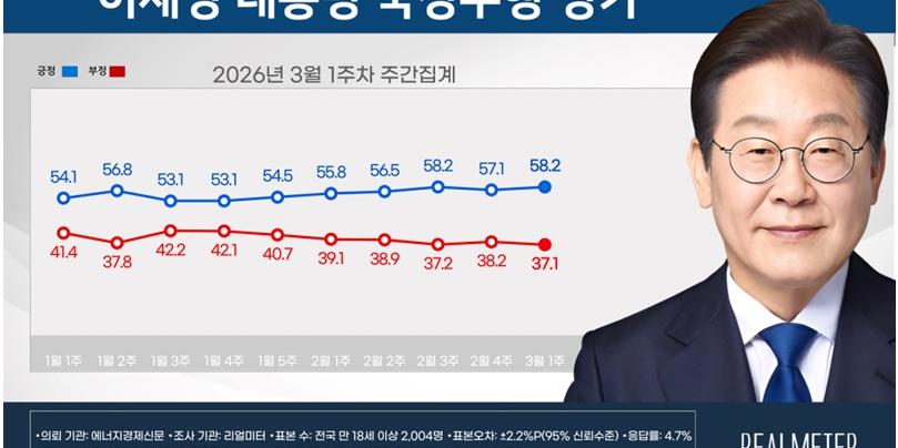 이재명 대통령의 지지율이 1주 만에 반등했다는 여론조사 결과가 나왔다.리얼미터가 9일 발표한 이재명 대통령 국정수행 평가에서 긍정평가 58.2%, 부정평가 37.1%로 집계됐다. '잘 모름'은 4.7%였다.긍정평가가 부정평가의 차이는 20.1%포인트로 오차범위 밖이다. 긍정평가는 직전조사(2일 발표)보다 1.1%포인트 오른 반면, 부정평가는 1.1%포인트 내렸다.이 대통령 지지율은 1주 만에 반등하며 60%대에 근접했다.리얼미터는 '미국·이스라엘 이란 공습으로 환율 1500원 돌파와 코스피 폭락 위기가 닥쳤으나 대통령의 100조원 주식시장 안정 프로그램 지시와유가 최고가격 지정 검토 등 민생 중심 대응이 위기관리 능력을 긍정적으로 평가받아 지지율이 상승했다'고 분석했다.지역별로 긍정평가는 광주·전라(86.1%), 서울(54.8%), 인천·경기(59.2%)에서 각각 6.3%포인트, 4.9%포인트, 1.8%포인트 상승했다. 반면 대전·세종·충청(55.9%), 대구·경북(43.2%), 부산·울산·경남(51.0%)에서는 각각 6.4%포인트, 2.6%포인트, 1.5%포인트 내렸다.