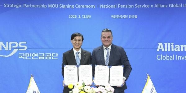 국민연금공단이 처음으로 글로벌 자산운용사와 전 자산군을 포괄하는 전략적 파트너십을 체결했다.국민연금공단은 13일 전북 혁신도시 공단 본부에서 '알리안츠 글로벌 인베스터스(이하 알리안츠GI)'와 전 자산군을 포괄하는 전략적 제휴를 위한 업무협약을 체결했다.이날 체결식에는 김성주 국민연금공단 이사장과 토비아스 프로스 알리안츠GI 최고경영자(CEO)가 참석했다.이번 전략적 제휴는 국민연금이 이전까지 주식, 채권, 대체투자 등 개별 자산군 단위에서 추진해 온 협력을 넘어 전 자산을 아우르는 전사 차원의 글로벌 전략적 파트너십을 공식화한 첫 사례다.1998년 설립한 알리안츠GI는 현재 주식, 채권, 멀티에셋, 사모 시장 등 다양한 자산군에 투자하는 글로벌 종합 자산운용사다.2025년 말 기준으로 약 6940억 달러(999조 원)의 자산을 운용하고 700명 이상의 전문가가 전 세계 21개 이상의 글로벌 사무소에서 활동하고 있다. 2006년부터 국민